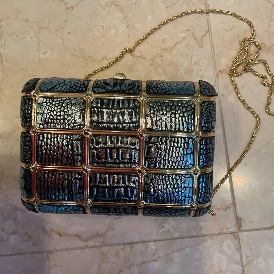 레트로 미니 사이즈 파티 백 체인을 수납하여 세컨드 백으로도 사용 가능 표면은 메탈릭 소재, 골드 런으로 심플한 드레스를 돋보이게 합니다. 색상 - 네이비 계열 파티 백 종류 - 클러치백 파티 백 종류 - 숄더백 특징 - 가마구치 부속품 - 숄더 스트랩 얼룩, 찢김 등 - 없음