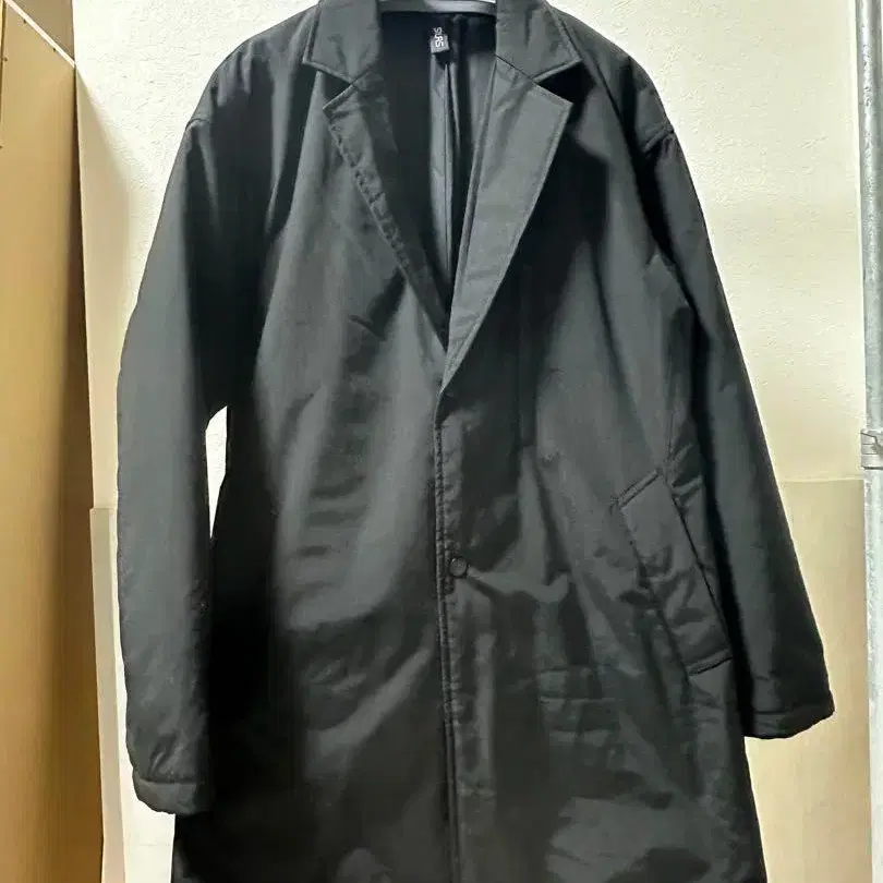 심플한 디자인의 블랙 체스터 코트, 나일론 소재로 가벼운 제품입니다.