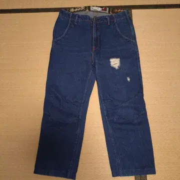데미지 가공이 들어간 라이트 블루 데님 팬츠, 편안한 착용감의 소재.
