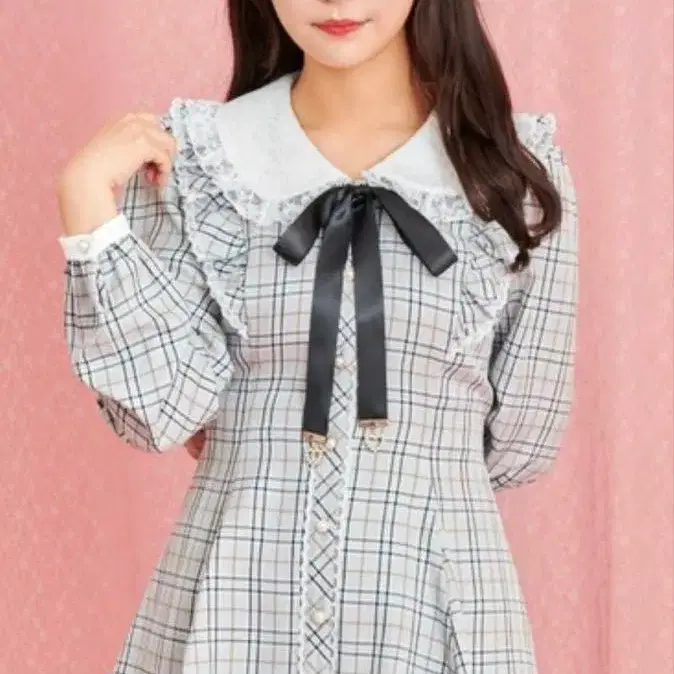 시크릿허니 레이스 옷깃 체크 무늬 셋업