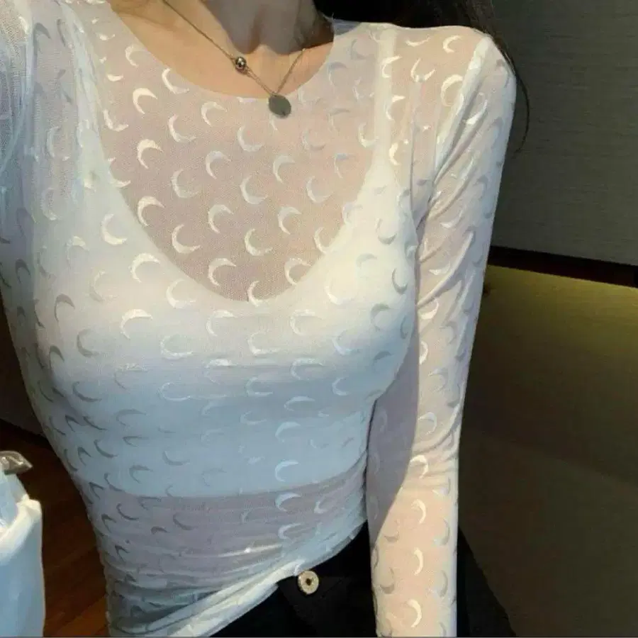 달 모양이 비치는 것이 특징인 긴팔 상의. - 컬러: 화이트 - 디자인: 달 모양이 비치는 원단 - 스타일: 레이어드 스타일 - 사이즈: 프리 사이즈 - 소재: 가벼운 원단 방문해 주셔서 감사합니다.