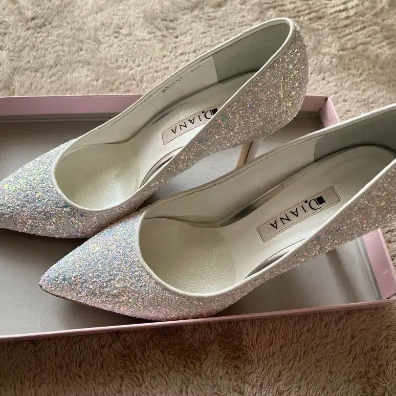 DIANA 글리터 실버 스틸레토 펌프스 사이즈: 22.5cm, 7cm 힐입니다. 사이즈가 조금 커서 미끄럼 방지 겸 투명 깔창을 사용했습니다. 깔창도 함께 보내드립니다 (1, 2번째 사진 참조). 결혼식, 사전 촬영 때 3회 정도 사용한 후 상자에 넣어 보관했습니다. 미세한 흠집이지만, 일부 글리터가 벗겨지려고 하는 부분과 발끝 부분이 얼룩진 곳이 있습니다 (3, 4번째 사진 참조). 중고품이므로 양해 부탁드립니다. ◎ 즉시 구매 x 네고 불가 검색용 #다이애나 #DIANA #글리터펌프스 #결혼식 #브라이덜슈즈 #웨딩슈즈