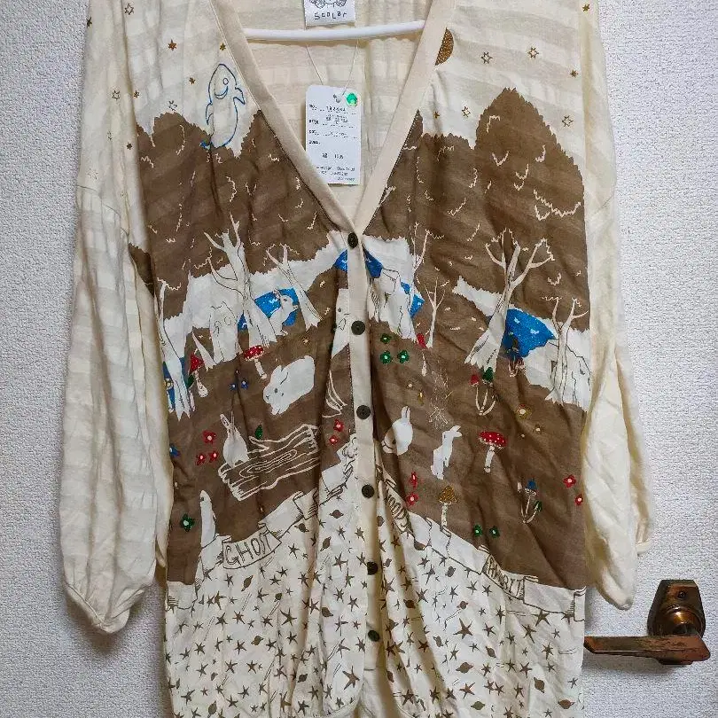 택 포함 미사용 새상품 풍경화 프린트와 비즈 장식의 아이보리 색상의 긴팔 가디건. - 색상: 아이보리 - 디자인: 풍경화 프린트 - 소매 길이: 긴팔 - 버튼: 프론트 오픈 버튼 방문해 주셔서 감사합니다.