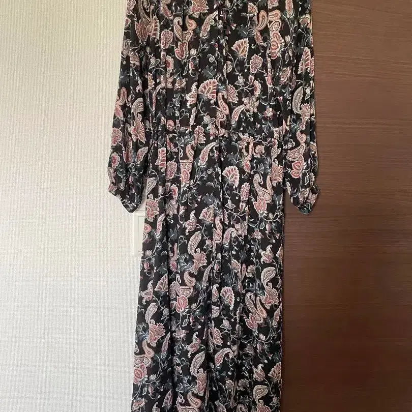 블랙과 핑크의 페이즐리 무늬 롱 원피스, 허리에 리본이 포함된 스타일리시한 디자인. - 색상: 블랙과 핑크의 페이즐리 무늬 - 스타일: 롱 원피스 - 특징: 허리에 리본 포함 방문해 주셔서 감사합니다.