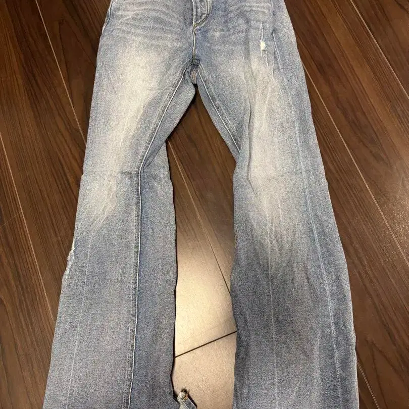 프린지 가공과 데미지 디자인의 부츠 컷 데님. - 디자인: 부츠 컷 데님 - 컬러: 연한 블루 - 특징: 프린지 가공, 데미지 가공 - 버튼: 4개의 버튼 방문해 주셔서 감사합니다. 몇 번 착용했습니다. 눈에 띄는 흠집이나 얼룩은 없지만, 사용감이 약간 있는 것 같습니다. 신경이 쓰이는 분은 삼가 주세요.