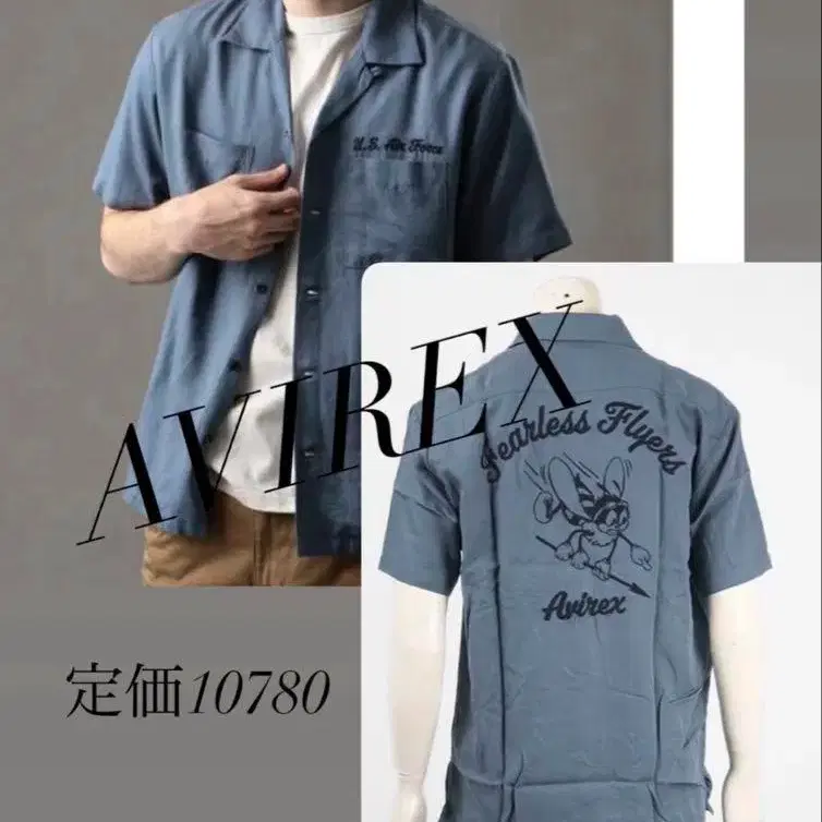 Avirex의 M 사이즈 그레이 반팔 워크 셔츠, Fearless Flyers 디자인, U.S. Air Force 자수 포함.