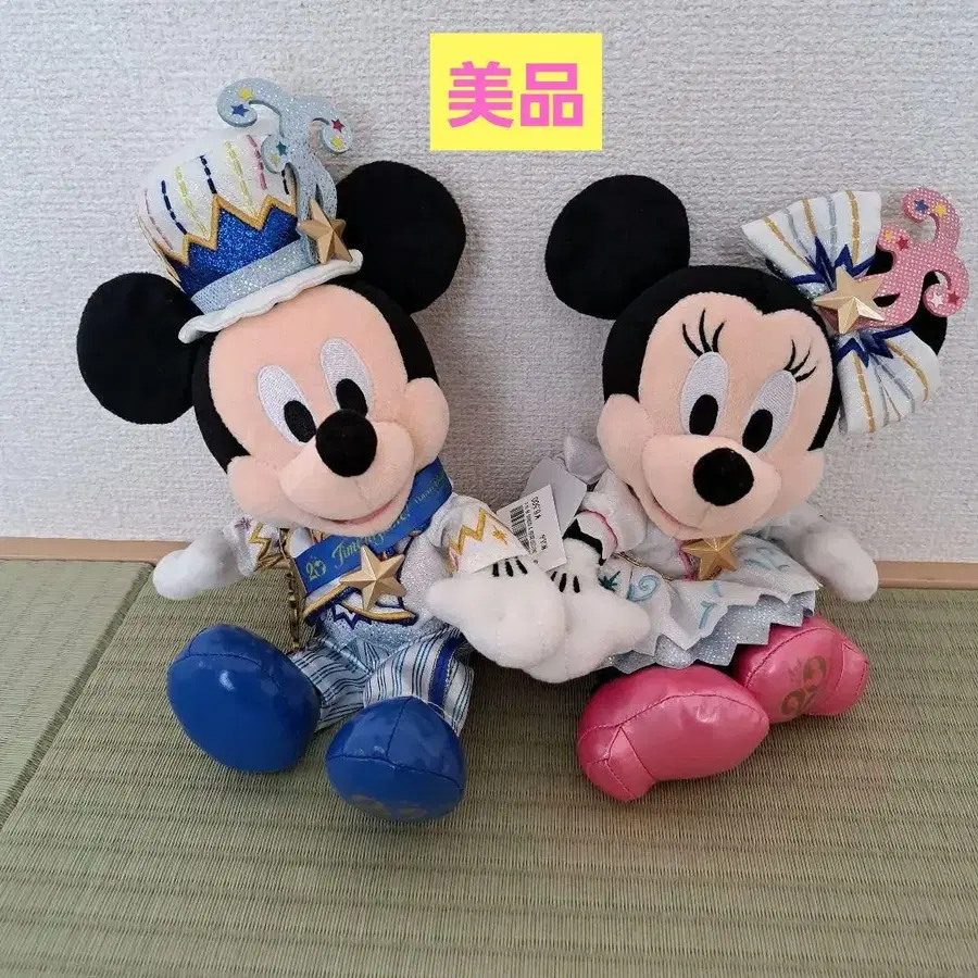 자동 번역되었어요. 원문보기미키와 미니의 20주년 기념 봉제 인형, 약 30cm 사이즈로, 파란색과 핑크색의 컬러풀한 디자인.