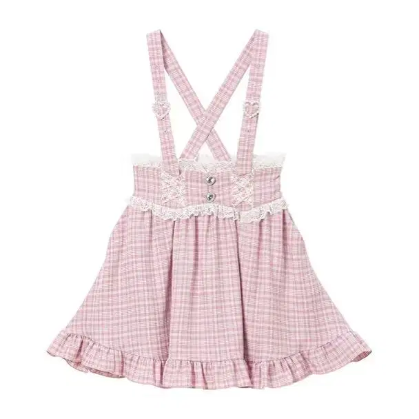 핑크 계열의 체크 무늬 플레어 스커트로, 레이스 장식과 서스펜더 스트랩이 달린 귀여운 디자인입니다.