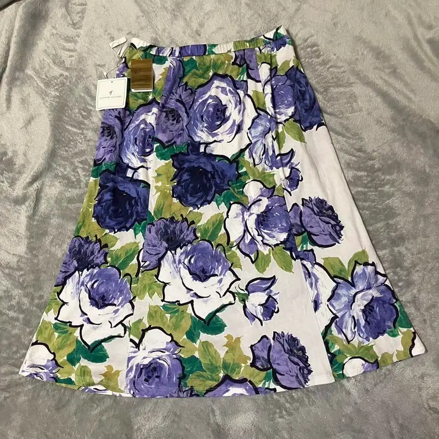 새상품 코튼 팩토리 무릎 아래 스커트 화이트 보라색 꽃 장미
