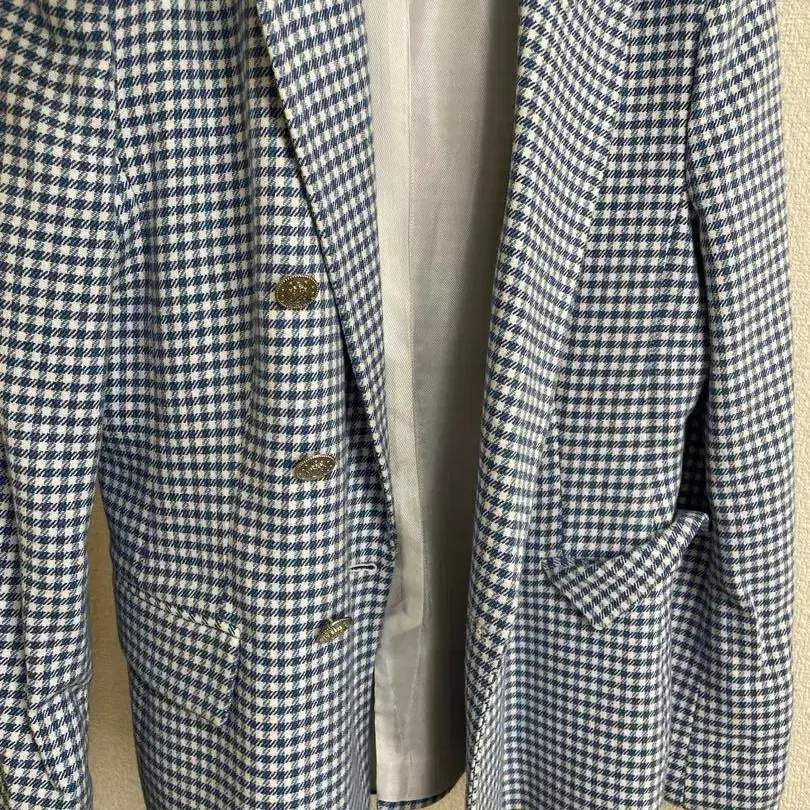 어깨 패드가 들어간 오버 사이즈 자켓입니다. 사진에서는 잘 모르실 수도 있지만 스카이블루 체크 무늬입니다. 포켓은 페이크입니다. 평상복으로도, 결혼식에도 착용하실 수 있습니다.