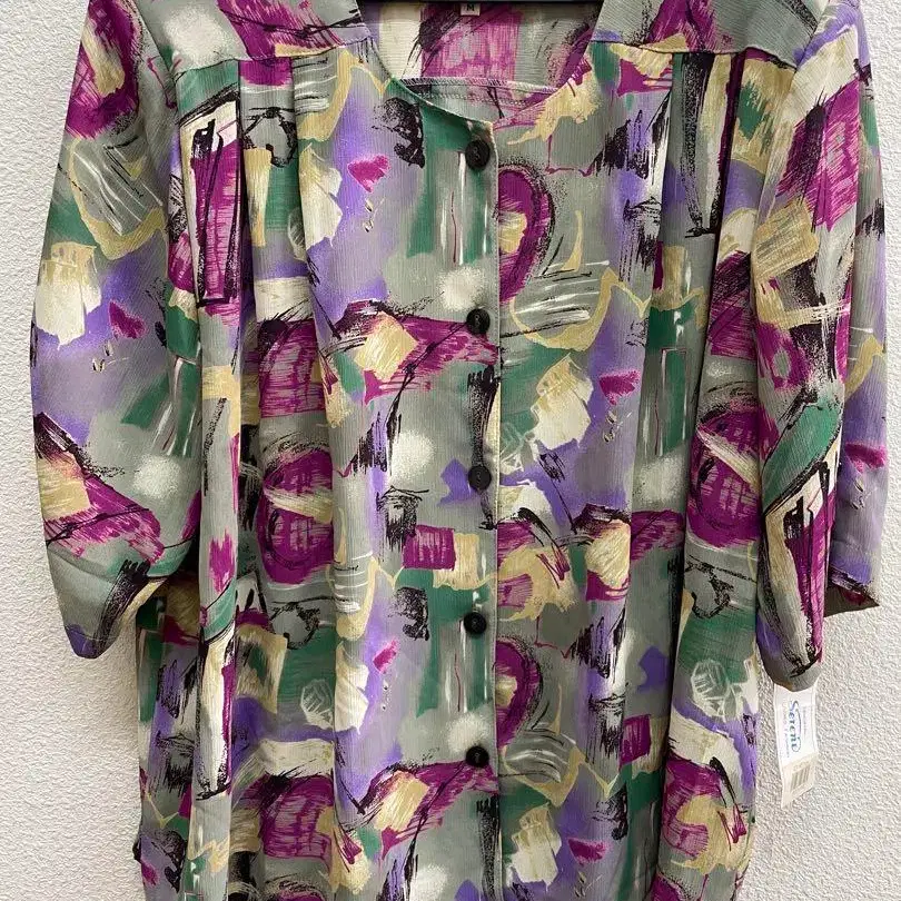 다색의 추상적인 패턴이 특징인 버튼이 달린 반팔 셔츠.
