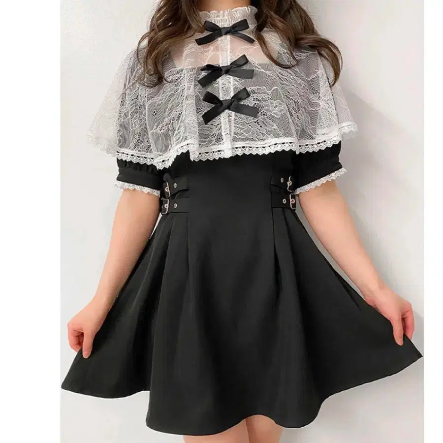 ROJITA 로지타 봄 여름 원피스 칼라 포함 오부 소매 반팔 검정 블랙 레이스 프릴 리본 케이프 지뢰계 양산형