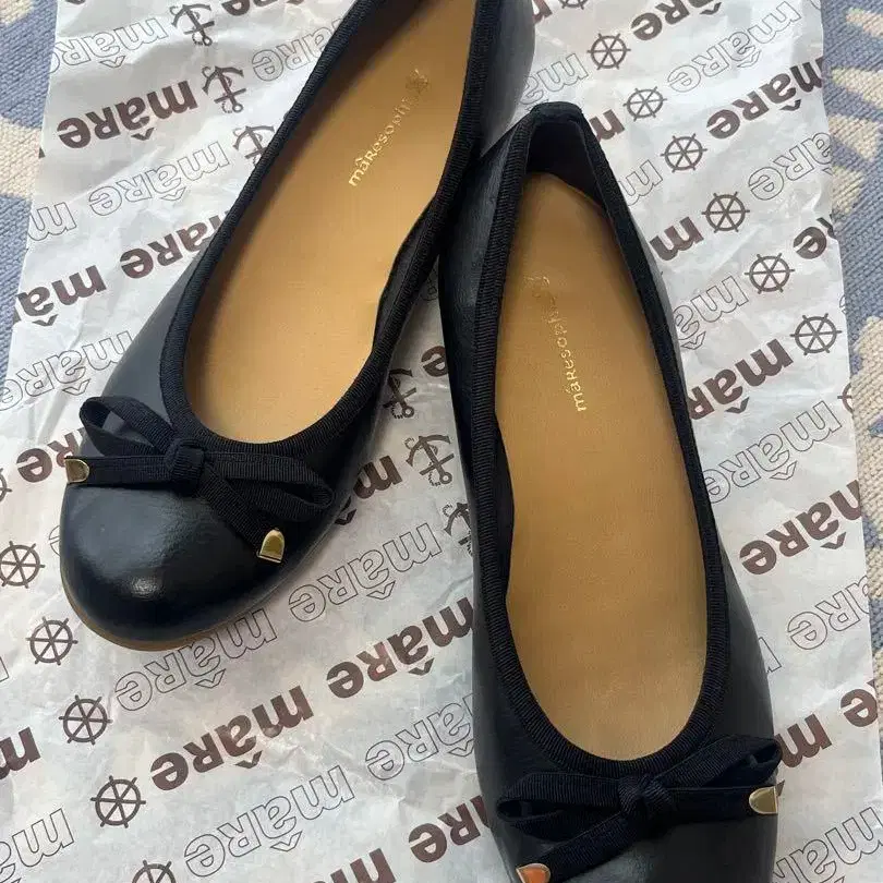 리본이 포함된 블랙 플랫 슈즈, 사이즈 22.5cm, 합성 피혁 제품.