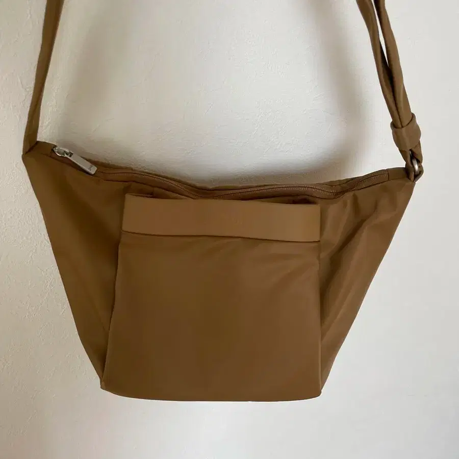 심플하고 실용적인 디자인의 브라운 숄더백. 사선으로 멜 수 있습니다.