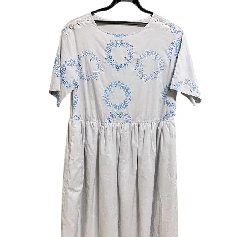 하우피아의 귀여운 자수가 들어간 스카이블루 반팔 원피스입니다. 어깨에 버튼이 달려 있으며, 반팔 길이가 긴 편입니다. 넉넉한 실루엣입니다. 사진에서는 그레이로 보이지만, 실물은 좀 더 스카이블루에 가깝습니다. -기장: 약 100cm -가슴둘레: 약 45cm -색상: 라이트 블루 그레이 -디자인: 파란 꽃무늬 - 소매 스타일: 반팔 - 허리 스타일: 개더 - 버튼: 어깨에 버튼 당시 매장에서 마음에 들어 구입했지만, 거의 입지 않아 눈에 띄는 얼룩도 없고 깨끗한 상태입니다. 컬러···블루 계열 무늬···꽃무늬 계절···봄/여름 얼룩, 찢김, 냄새 등···없음
