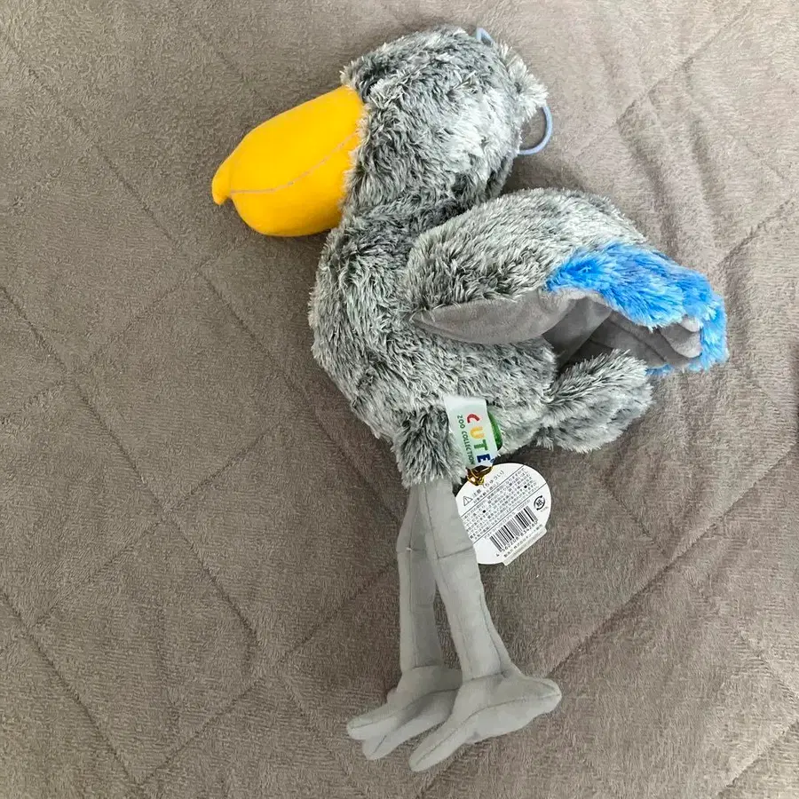부드러운 봉제 인형 소재의 그레이와 옐로우 컬러의 펠리컨, 파란 깃털이 달려 있으며 길이는 약 40cm입니다.