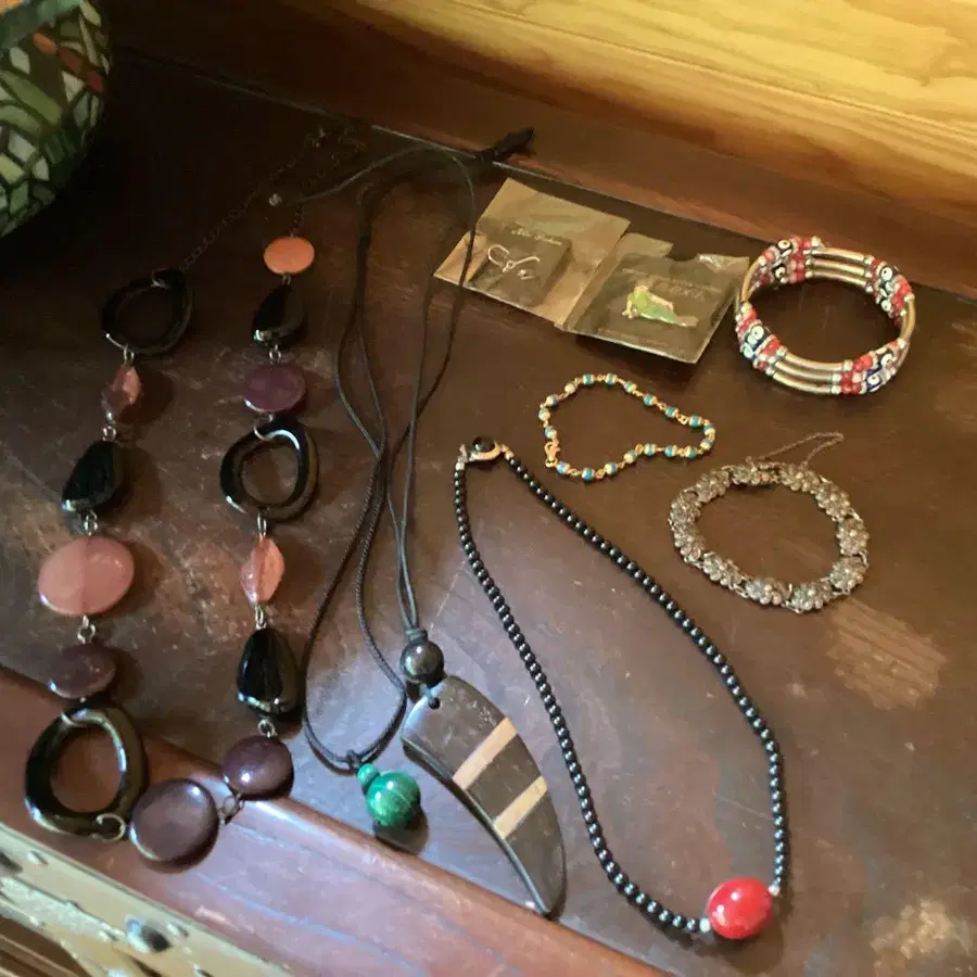 여러 가지 색의 비즈와 에스닉 디자인의 목걸이, 꽃 장식이 특징입니다. 해외 기념품, 부티크에서 판매되는 목걸이 - 목걸이 종류: 비즈 목걸이 - 색상: 여러 가지 색상 (검정, 핑크, 보라, 녹색, 빨강) - 소재: 비즈, 금속, 목재 - 디자인: 에스닉 스타일 - 특징: 꽃 디자인 장식 - 기타 액세서리: 팔찌, 핀 배지 방문해 주셔서 감사합니다.