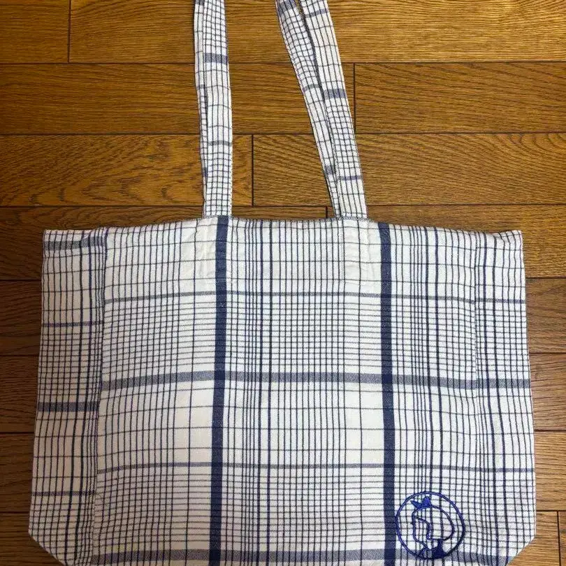 화이트와 파랑 체크 무늬의 토트백, 이야마짱 로고 자수 포함.