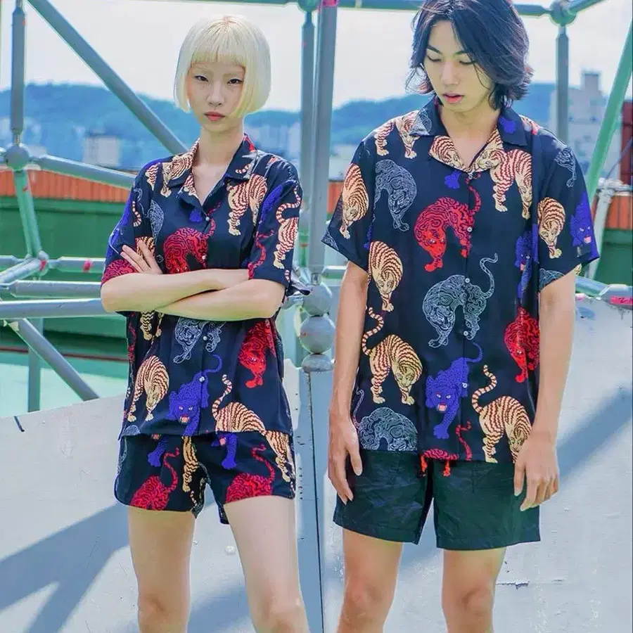 한국 브랜드 VEGAN TIGER의 타이거 프린트 셔츠 L 사이즈 블랙