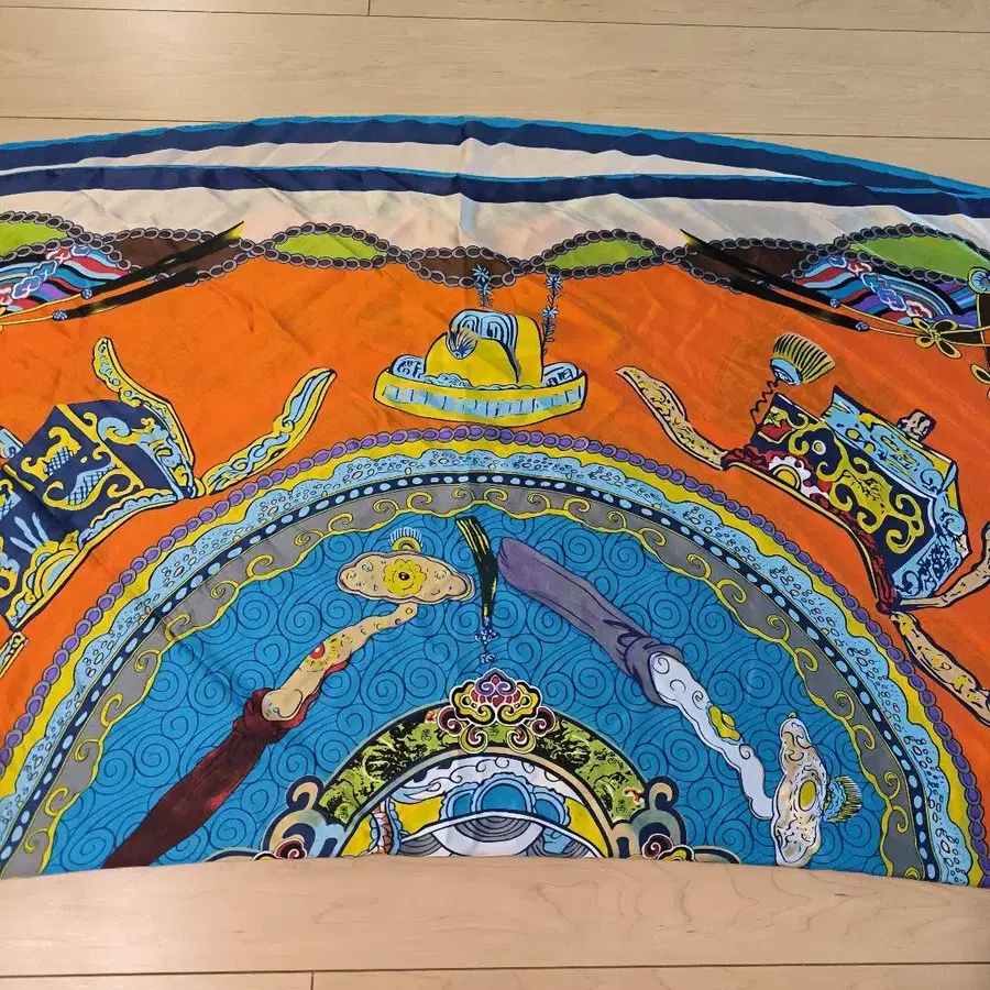 다색의 장식적인 패턴이 특징인 대형 스카프, 숄 한 번도 사용하지 않고 집에서 보관하고 있습니다. - 컬러: 오렌지, 블루, ... 하늘색, 옐로우, 블랙, 화이트, 옐로우 그린 - 디자인: 다색의 장식적인 패턴 - 소재: 실크 또는 유사한 부드러운 소재 - 사이즈: 대형 스카프 - 스타일: 엘레강트, 아트풍 - 용도: 패션 액세서리, 헤드 스카프, 가방 장식 130×130 실크 30 프랑스 제 방문해 주셔서 감사합니다