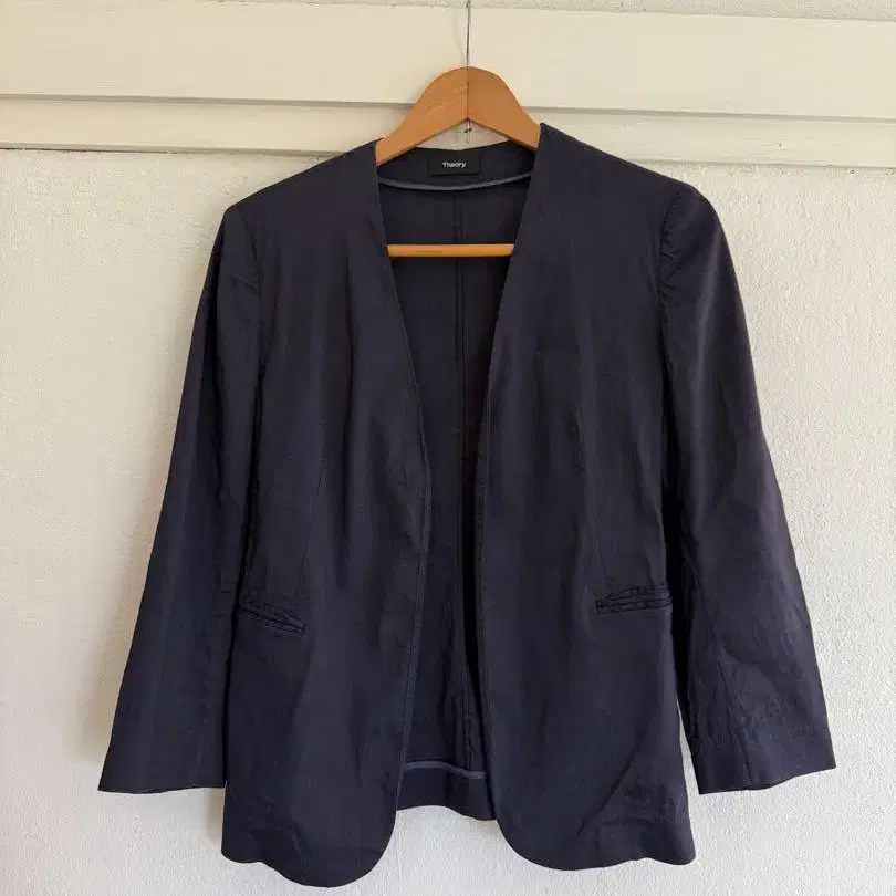 띠어리 노카라 자켓 린넨 네이비 사이즈 4