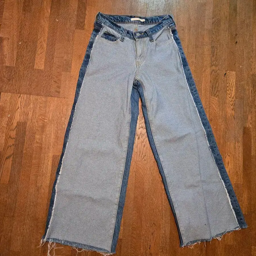 배기 와이드 레그 데님, 라이트 블루와 다크 블루의 콤비네이션으로 유니크한 스타일.