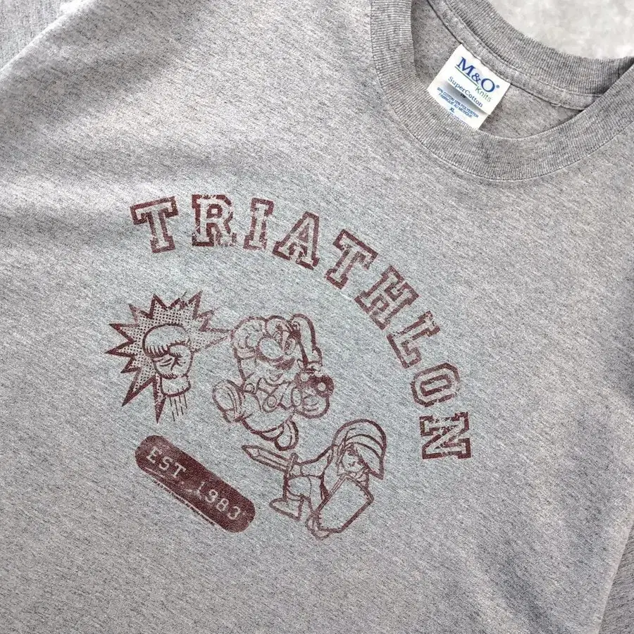 "TRIATHLON EST. 1980" 문구와 함께 마리오와 젤다의 캐릭터가 프린트된 티셔츠.