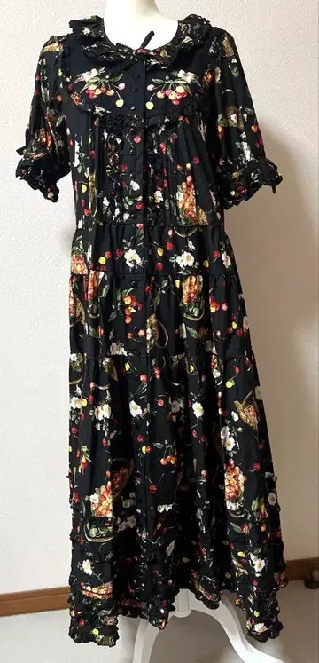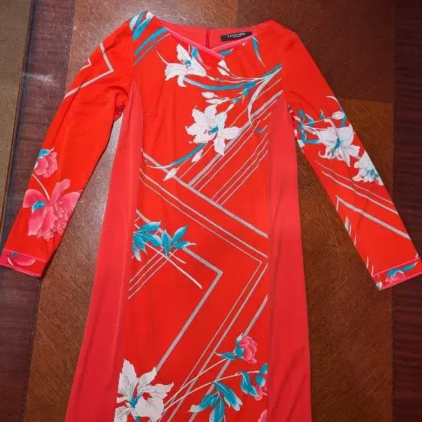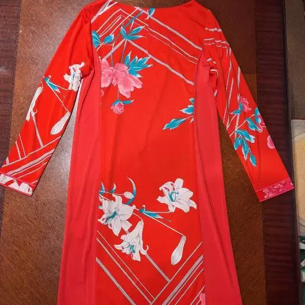 자동 번역되었어요. 원문보기선명한 빨간색에 꽃무늬 디자인이 특징인 긴팔 칸칸 소재 원피스.