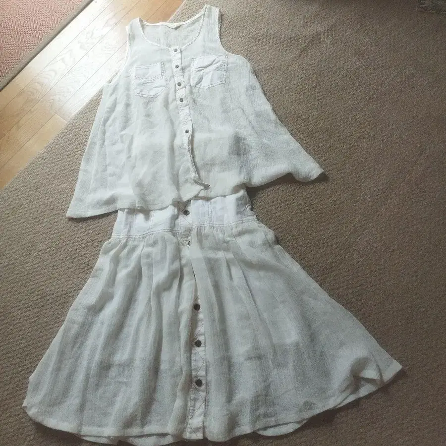 경량 소재의 화이트 기장 긴 베스트와 스커트 셋업, 우드 버튼이 달린 슬리브리스 디자인. - 색상: 화이트 - 스타일: 베스트와 스커트 셋업 - 소재: 경량 소재, 거즈 같은 원단으로 착용 시 매우 시원합니다. - 디자인: 버튼 포함, 아래에 긴팔을 착용하면 봄/가을에도 멋스럽고 그 위에 베스트를 입은 느낌도 낼 수 있습니다. - 스커트 형태: 허리 아래부터 절개된 플레어 디자인. 봉제가 꼼꼼하고 튼튼합니다. 방문해 주셔서 감사합니다.