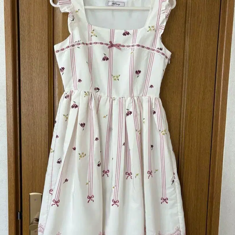 프릴이 달린 화이트 슬리브리스 원피스, 꽃무늬 자수와 리본이 특징입니다.