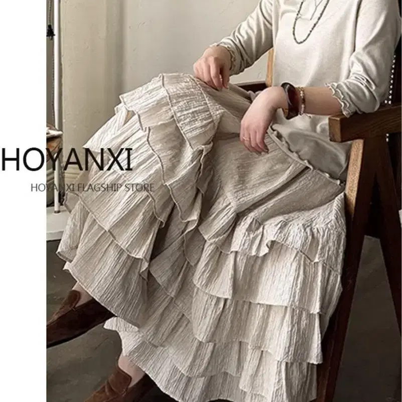 프릴이 달린 롱 스커트 5층 텐셀 원단 크림색