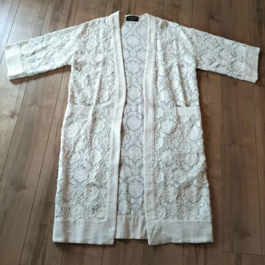 부드러운 밀키 화이트칼라의 자수 레이스 소재의 롱 가디건입니다. 긴팔이 아닌 9부 소매입니다.