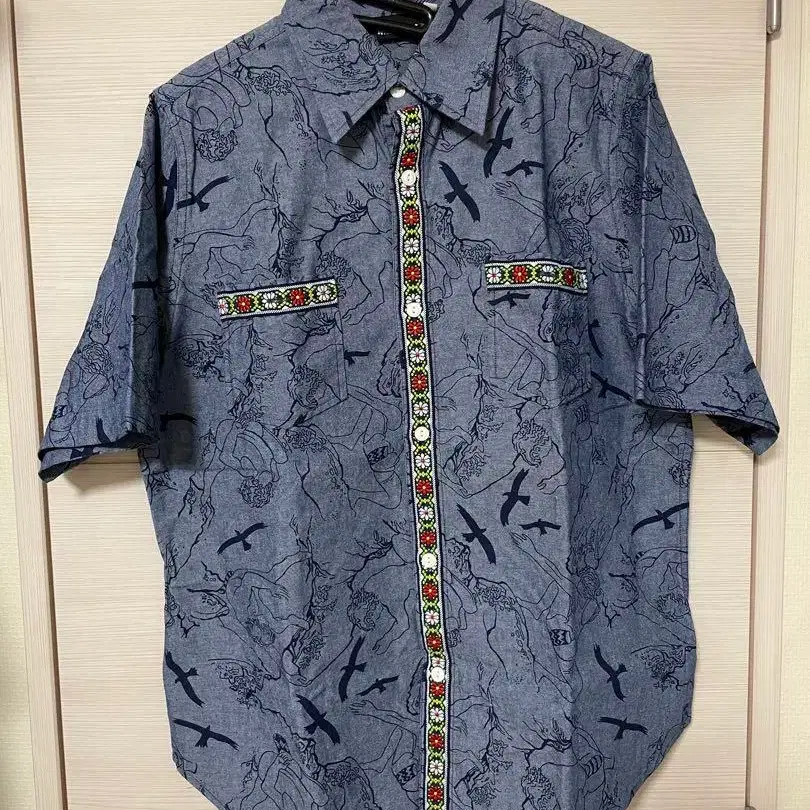 새 패턴과 비즈 장식이 특징인 파란색 계열의 반팔 워크 셔츠입니다.
