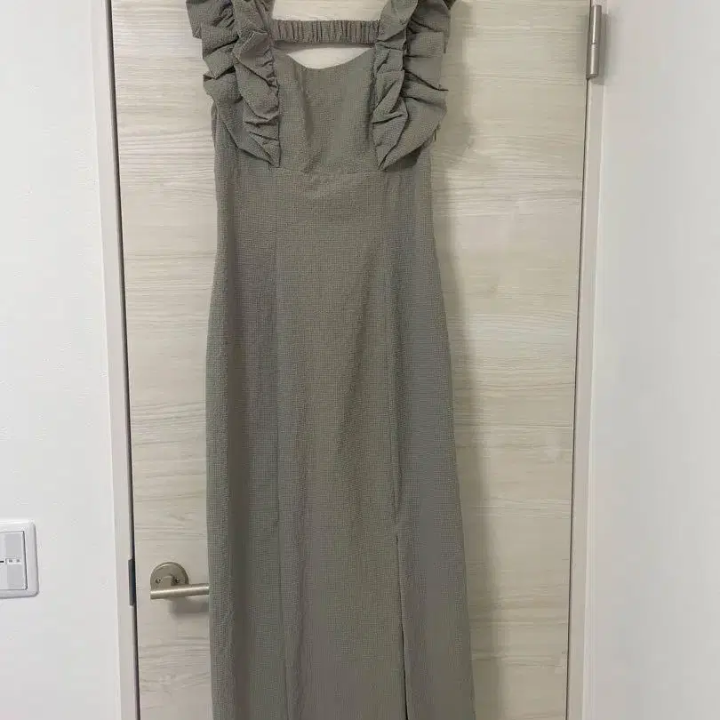 시착만 한 미사용 상품입니다. 프릴과 슬릿이 특징인 그레이 슬리브리스 롱 원피스. - 색상: 카키 - 디자인: 프릴 포함 슬리브리스 - 스타일: 슬릿이 있는 롱 원피스 - 허리: 리본 포함 셔링 - 소재: 가볍고 통기성이 좋은 원단 방문해 주셔서 감사합니다.