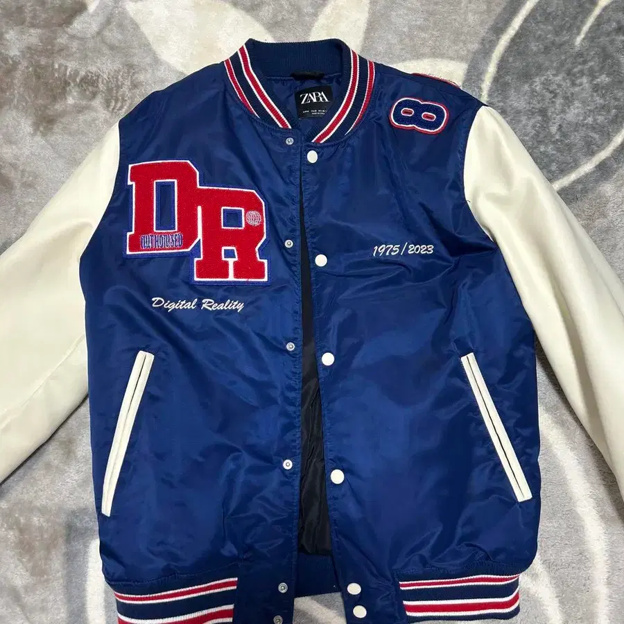 자라 본점에서 구입했습니다. 착용 횟수가 매우 적어 거의 미사용에 가까운 상태입니다. - 브랜드: 자라 - 모델: 바시티 자켓 - 색상: 네이비/화이트 - 특징: 자수 디자인 (DR, Digital Reality) - 사이즈: M