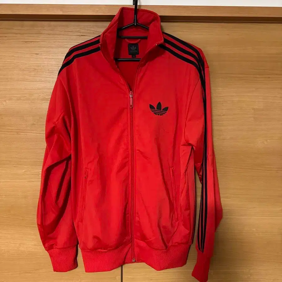 생기 넘치는 레드 컬러의 아디다스 집업 저지, M 사이즈, 3라인 디자인.