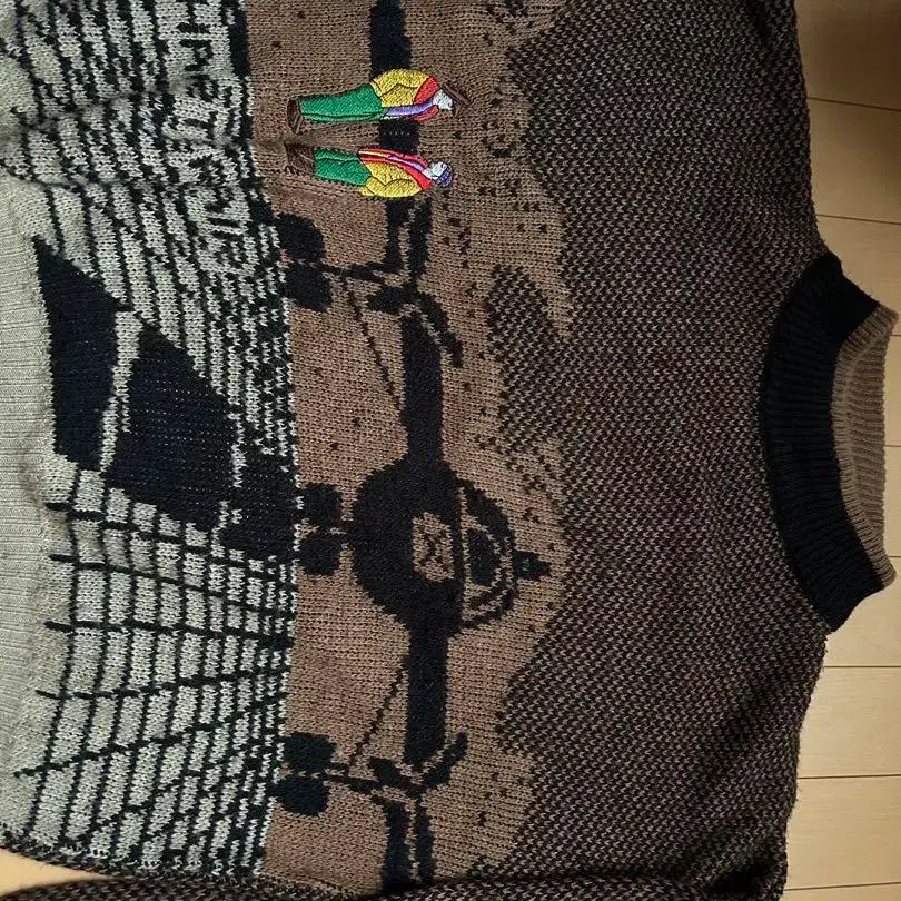비행기와 인물이 독특하게 엮인 디자인의 니트 스웨터.