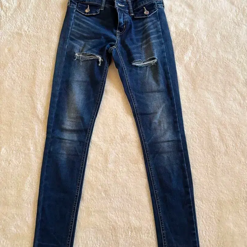 데미지 가공이 들어간 다크 블루 스키니 데님. 하이 웨스트 안쪽 다리 길이 약 72cm 얇고 스트레치가 잘 들어 있습니다. 봄/여름에 딱 좋습니다. 방문해 주셔서 감사합니다.