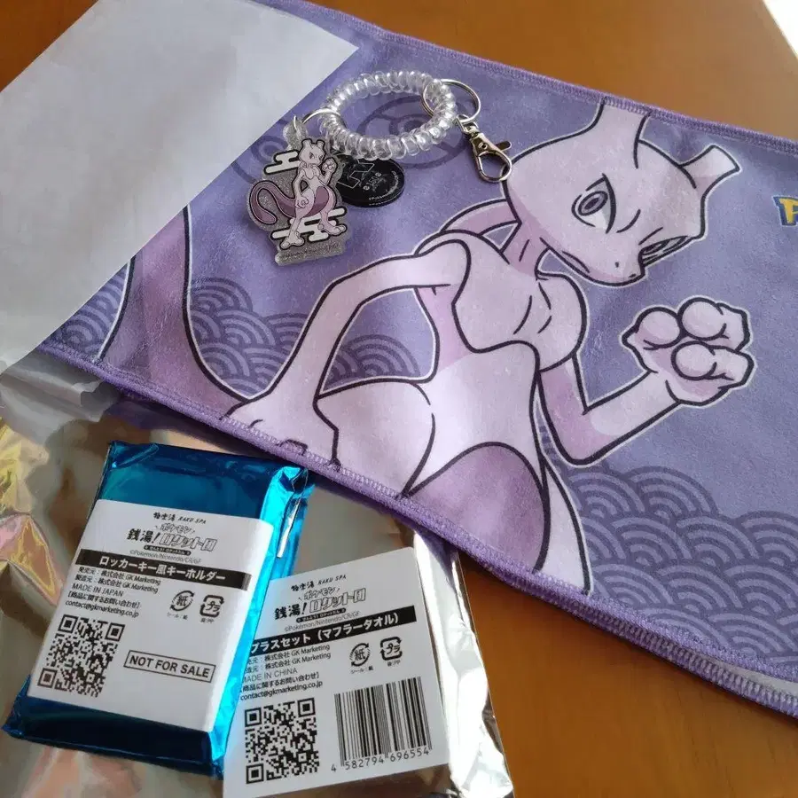 극락탕 RAKU SPA 포켓몬 목욕탕! 로켓단의 뮤우의 머플러 타월과 락카 키링입니다. 캐릭터 확인, 사진 촬영을 위해 꺼낸 후 원래 봉지에 보관하고 있습니다.