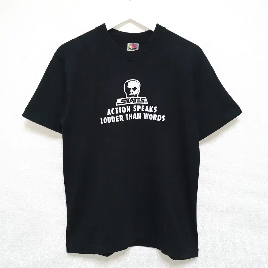 【댓글】:90년대 SKULL SKATES 티셔츠입니다. 캐나다 제, 프룻 오브 더 룸 택, 소매 싱글, 희귀한 블랙 컬러의 초기 모델입니다. 사용감이 없는 깨끗한 상품입니다. 오래된 상품이므로 중고 상품으로 취급해 주시기 바랍니다.