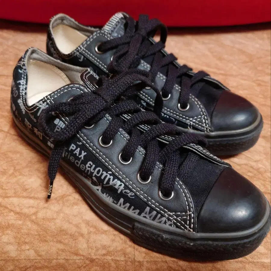 폐업한 신발 가게의 창고에서 발견한 것을 구매한 후, 한 번 신어본 후 상자에 넣어 보관하고 있었습니다. 컨버스 24.5cm ※상자 없음 JOHN LENON(존 레논)을 채용한 PEACE PACK 시리즈의 한정판 모델. PC는 'Peace'의 약자로, 2004년 가을/겨울 'PEACE COLLECTION'의 아이템 중 하나입니다. 캔버스 소재의 어퍼에 세계 13개국에서 '평화'를 의미하는 문자를 엠보로 표현했습니다. 슈레이스에도 '2004 PEACE'가 프린트되어 있으며, 일부 가죽을 사용하여 디테일까지 신경을 쓴 한 켤레입니다. 접착제가 튀어 나와 변색된 부분이 있으므로 사진으로 확인하시기 바랍니다. 고양이가 들어가지 않는 방에서 보관했지만, 미세한 털이 묻어 있습니다. 배송 시에는 먼지 등을 가능한 한 제거한 후 에어캡 등으로 포장하여 발송할 예정입니다.