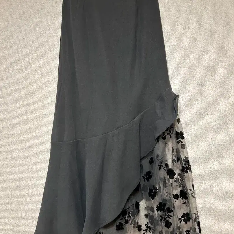 프릴과 플라워 패턴의 쉬폰이 특징인 비대칭 그레이 롱 스커트.