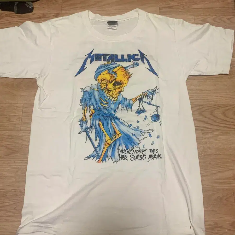 Metallica의 스켈레톤 디자인 화이트 티셔츠.