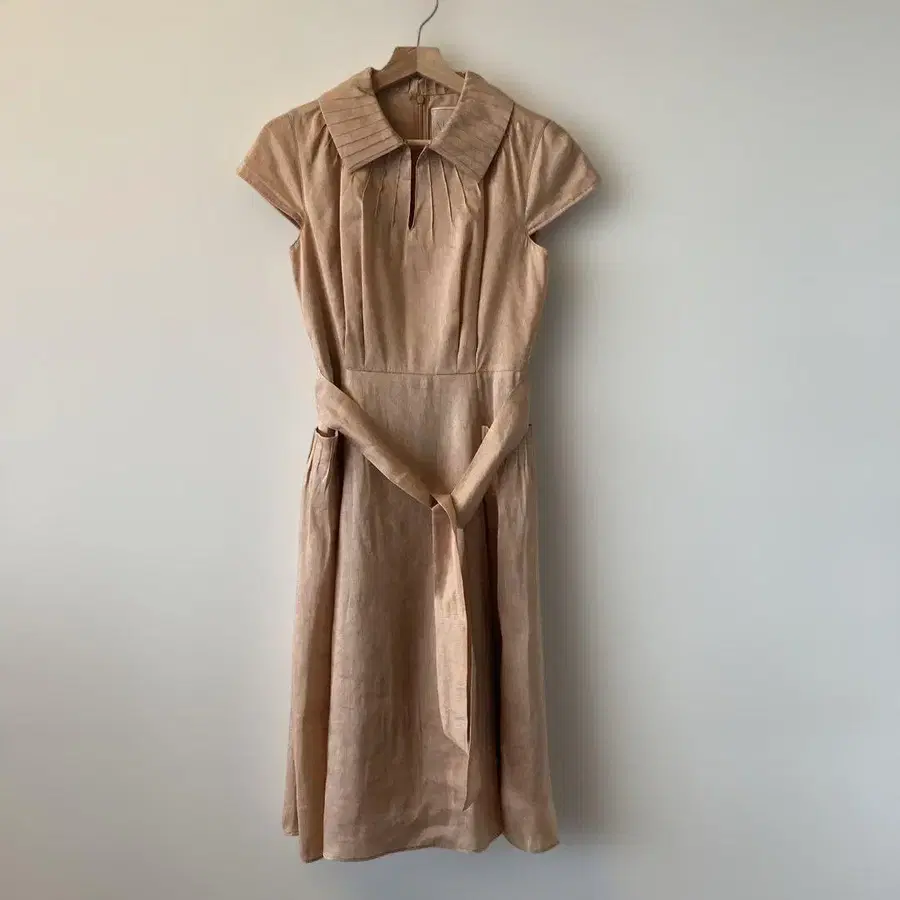 시빌라 새상품 베이지 카라 부착 미디 길이 원피스 린넨, 시쿠루