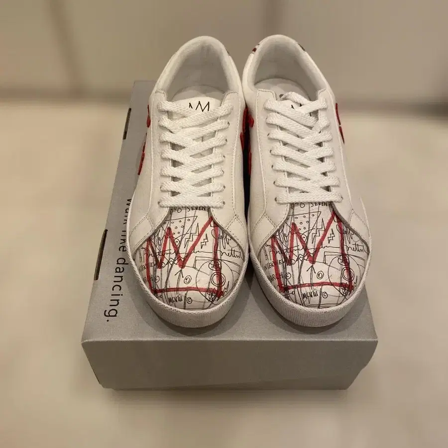 아트 프린트가 들어간 화이트 스니커즈. - 모델명: JEAN-MICHEL BASQUIAT 스니커즈 - 컬러: 화이트/레드 - 디자인: 아트 프린트 - 특징: 백에 아트 워크 방문해 주셔서 감사합니다.