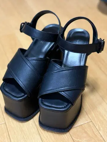 크로스 스트랩 디자인의 블랙 합성 피혁 샌들, 에스파드리유 스타일의 밑창이 특징입니다. - 색상: 블랙 - 디자인: 크로스 스트랩 - 소재: 합성 가죽 - 밑창: 에스파드리유 스타일 - 버클: 금속 버클 상당히 깨끗한 상품이지만, 오른쪽에 희미하게 마모 자국이 있습니다. 별로 눈에 띄지 않는 정도입니다. 두꺼운 밑창이 귀엽습니다. M 사이즈이지만, 조절이 가능합니다. 힐 높이 5cm