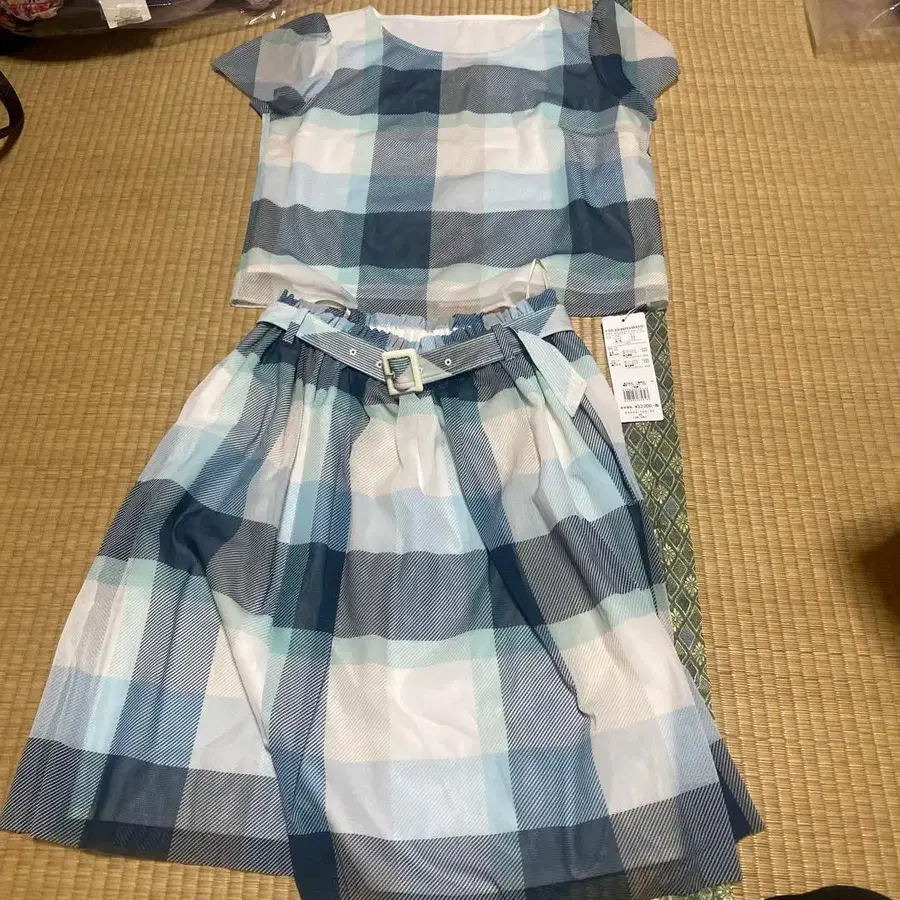 파란색 계열의 체크 무늬, 폴리에스테르 소재의 셋업. - 색상: 파란색 계열 체크 무늬 - 사이즈: 36 - 소재: 폴리에스테르 100%(스커트), 코튼 32%, 폴리에스테르 68%(상의) - 스타일: 셋업 - 부속품: 벨트 포함 방문해 주셔서 감사합니다.