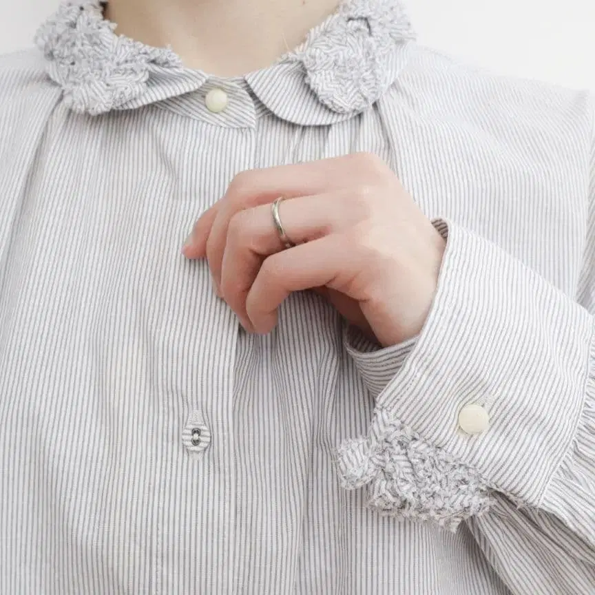 l'atelier du savon 아틀리에 드 사봉 꽃 테이프 자수 롱 셔츠 원피스 컬러: 그레이 × 화이트 스트라이프 사이즈: FREE 가슴둘레 61cm 어깨너비 49cm 총길이 113cm 소매 길이 51cm 입체적인 꽃 테이프 자수가 칼라와 소매에 배치된 특별함이 느껴지는 원피스입니다. 앞이 열리므로 겉옷으로도 사용할 수 있습니다. 양쪽에 포켓이 있습니다.