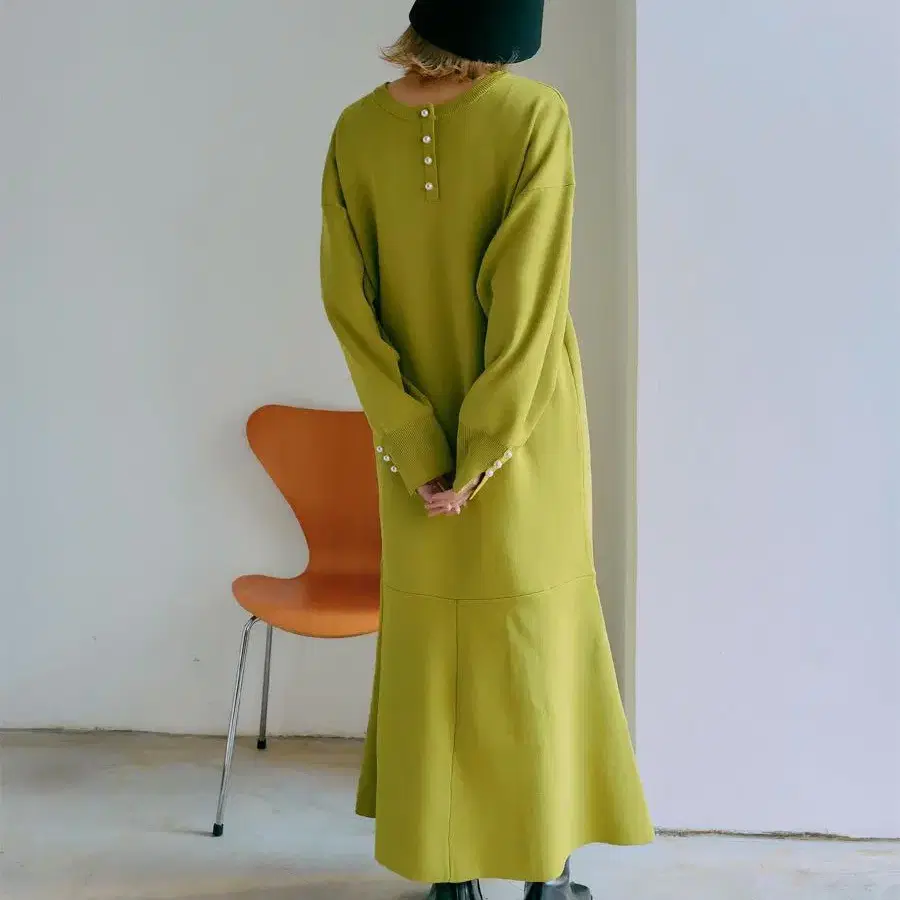 펄 버튼이 악센트를 더하는 구조적인 니트 소재 원피스.