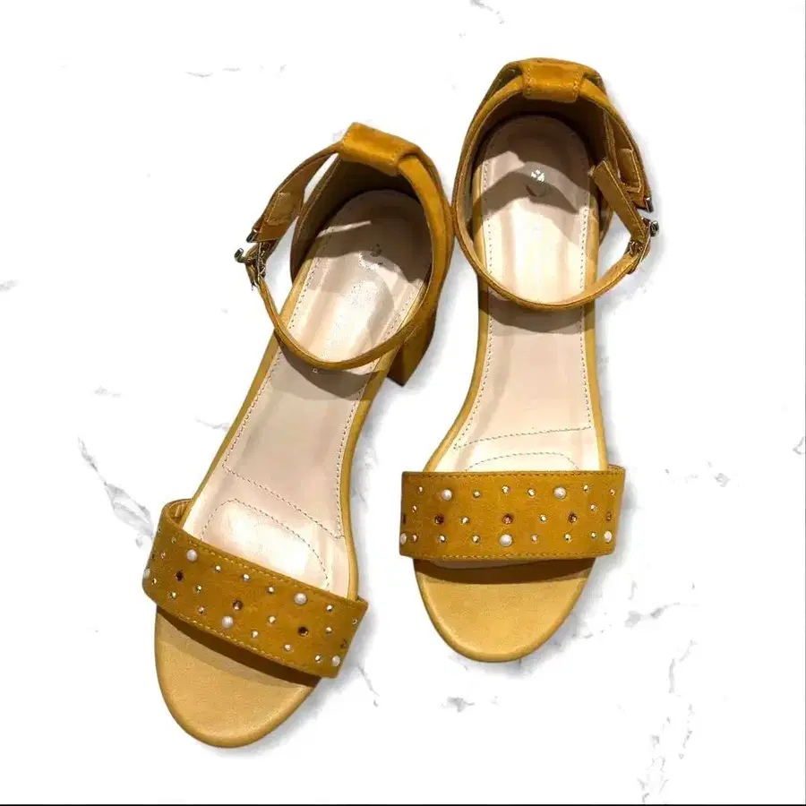 프라이빗 라벨 머스타드 오픈토 샌들 미들 힐 비쥬
